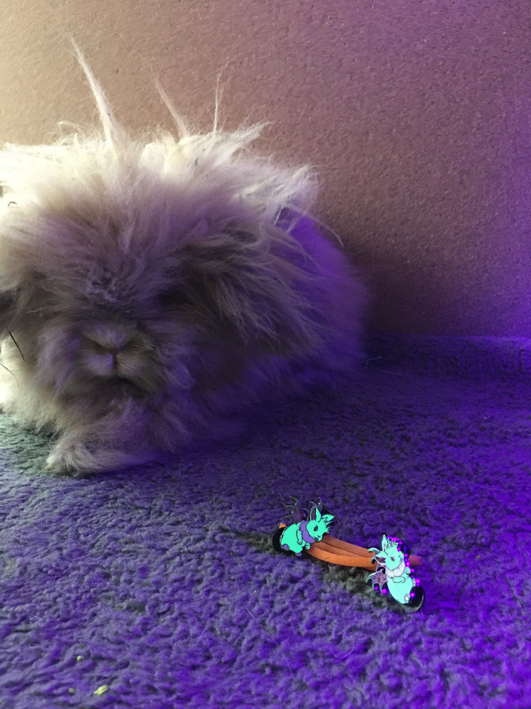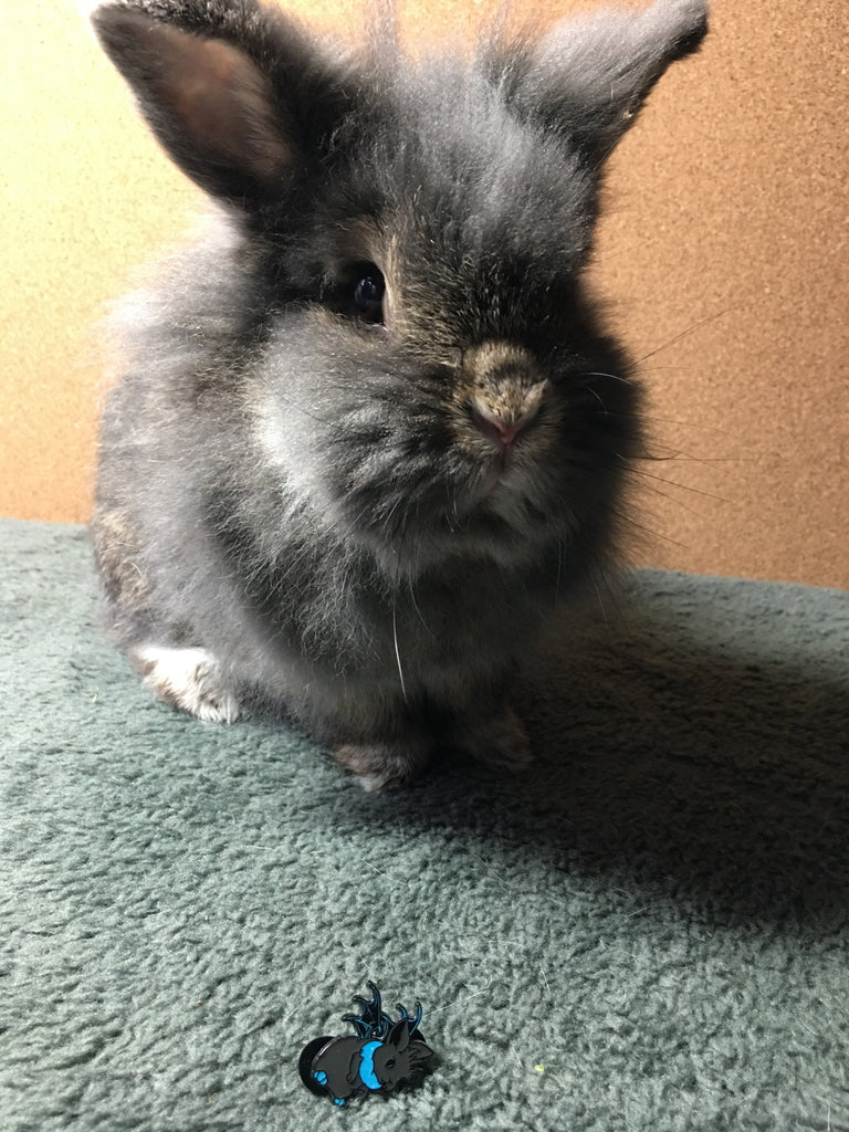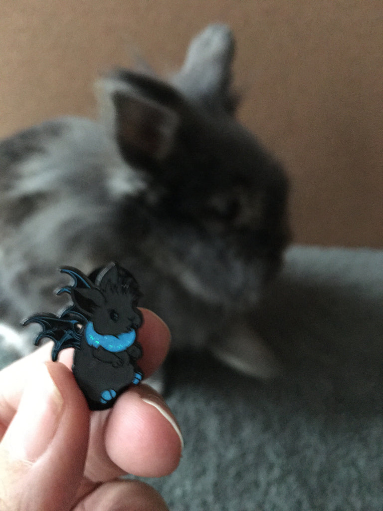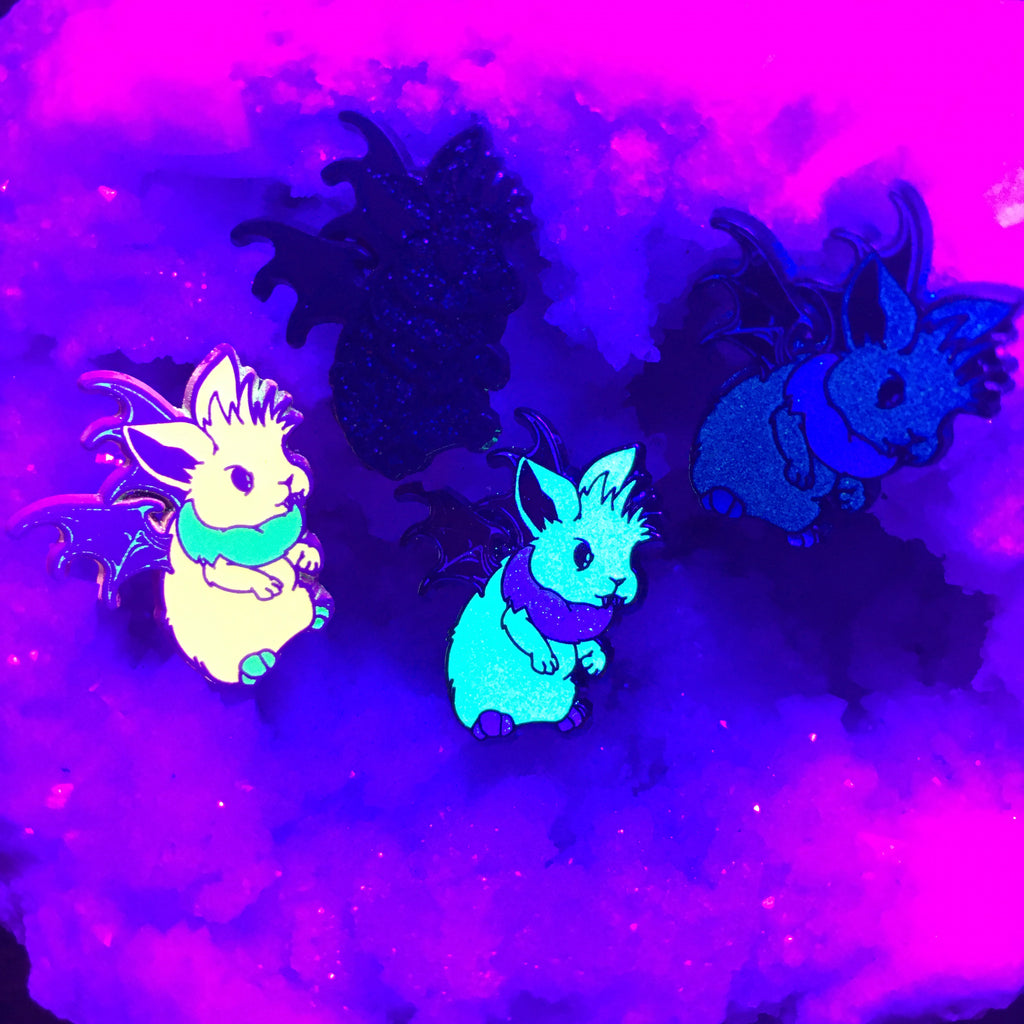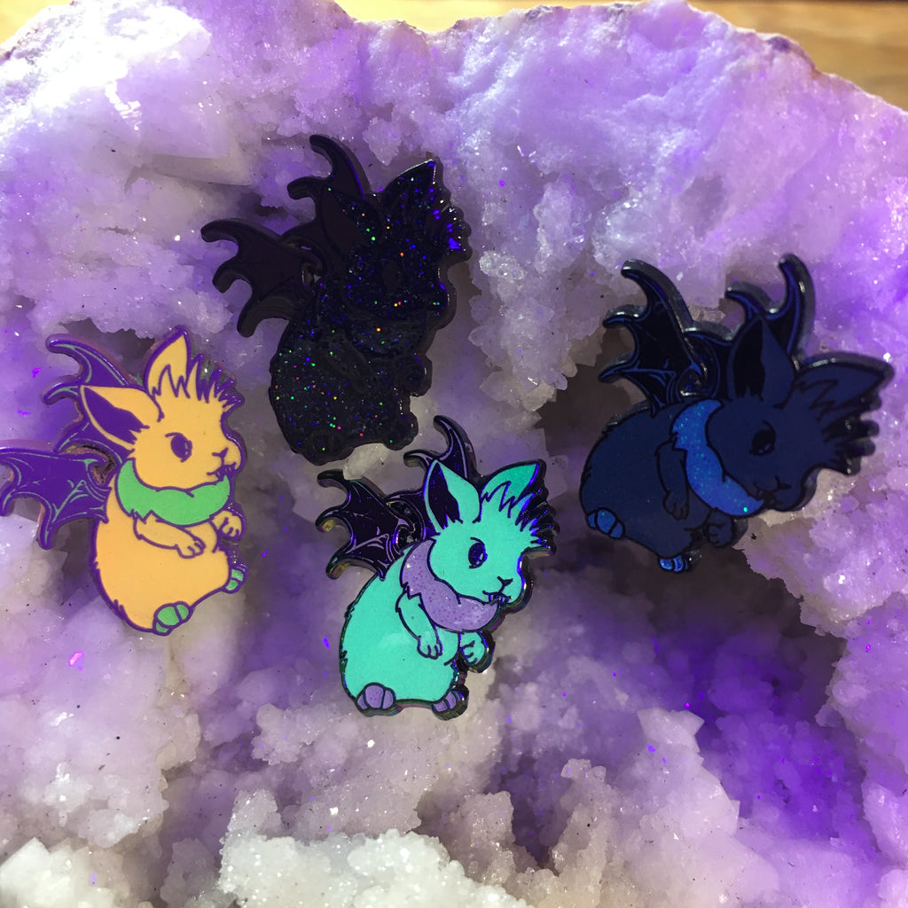 These spooky tiny pins come in four limited edition variants which include UV active; glow in the dark; glitter; all coated in with a luxe finished epoxy. Names inspired by Spooky Bunny’s real life fur babies: Aslan, Cadbury, Squirrel, Aggie.